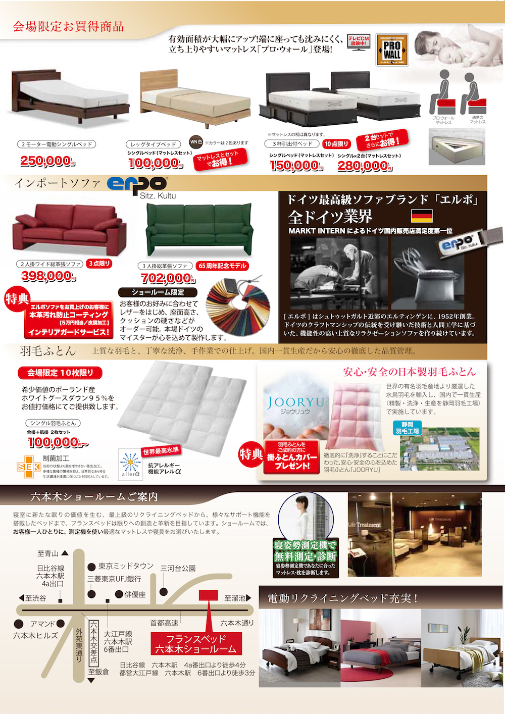 フランスベッドの最上級のくつろぎと、深いやすらぎを存分にお試しいただけます! さらに、ご優待価格でご提供させていただきます! |