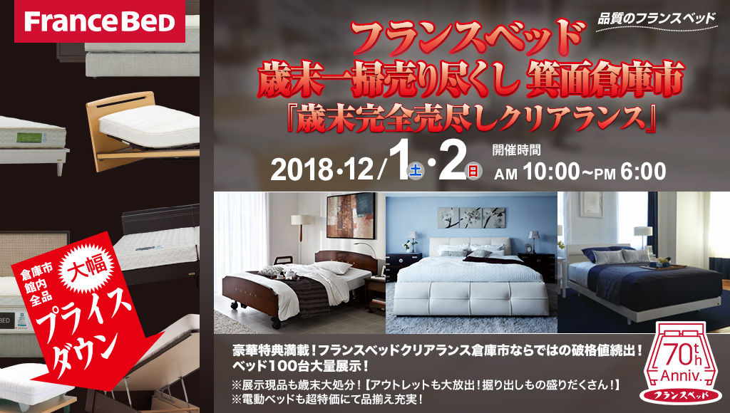 フランスベッド箕面倉庫市『全館全品歳末完全売尽しセール!』館内全品大幅プライスダウン! 新作、展示現品も全商品、歳末クリアランス超特価にて特別大処分! 数量限定の特別ご奉仕品、展示現品も2日間限りの超特価にて大放出!