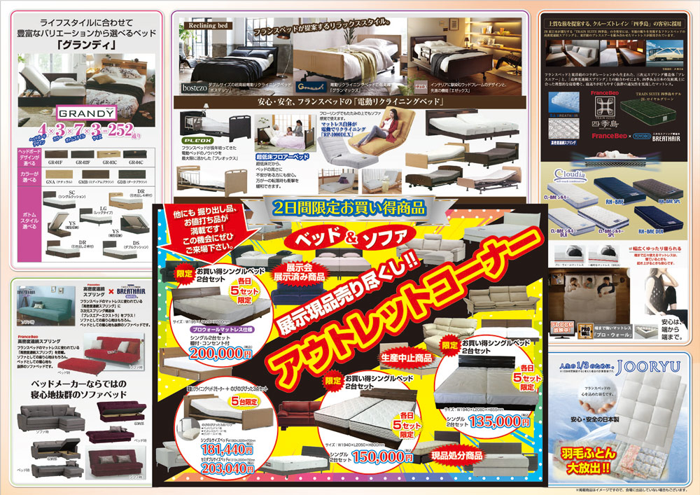 フランスベッド 枚方アウトレット・全品完全売尽しセール!大幅プライスOFF!新作、展示現品も全商品、超特価にて特別大処分! 新作・展示現品・数量限定品・廃型品など、当サイト特別価格でご提示いたします! |