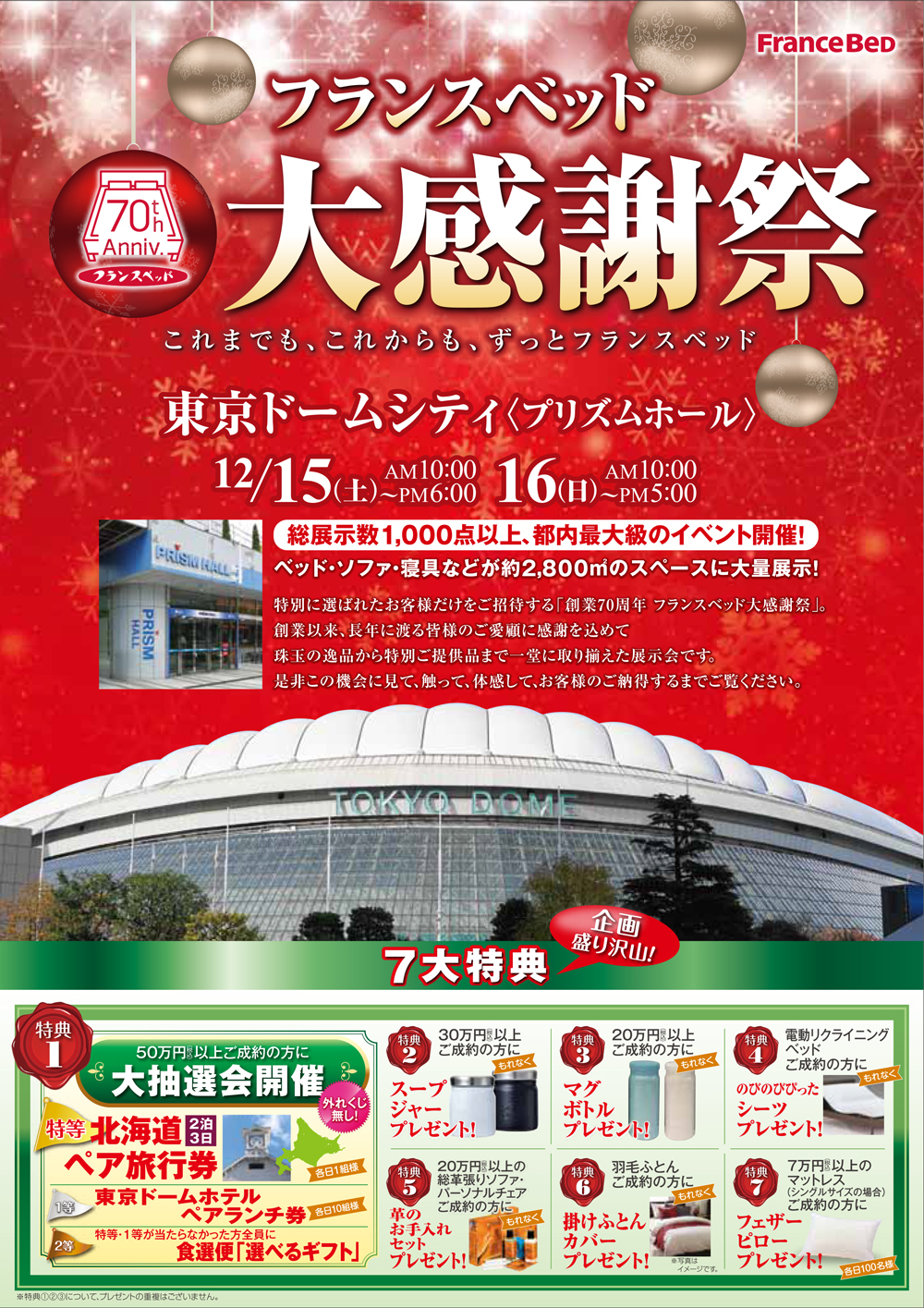 「50万円以上のご成約のお客様」に、「大抽選会(外れくじ無し)」を開催! 【特等】北海道ペア旅行券(2泊3日)(各日1組様) 【1等】東京ドームホテル・ペアランチ券(各日10組様) 【2等】【特等・1等が当たらなかった方全員に】食選便「選べるギフト」 |
