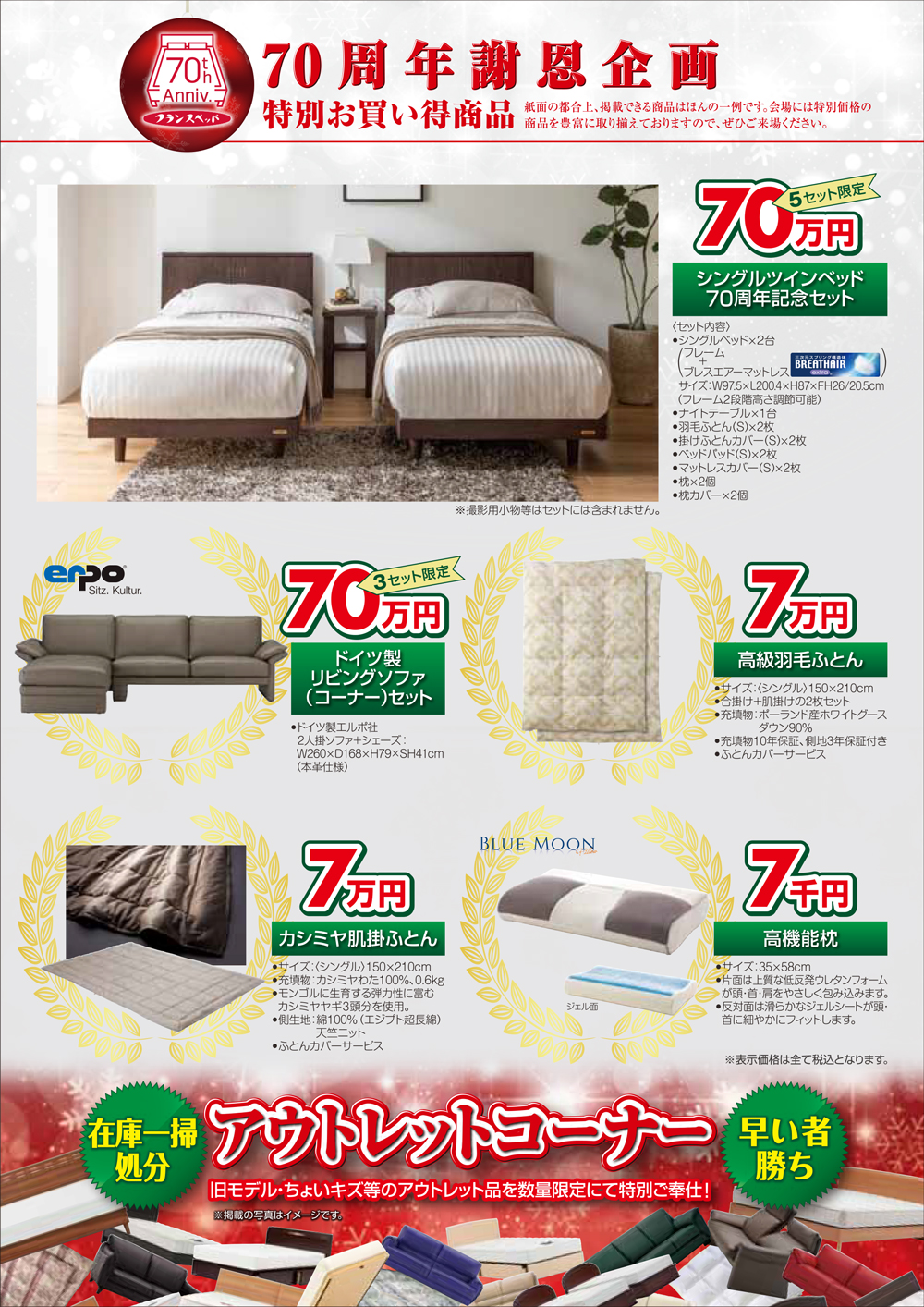 高品質フランスベッドを、年に一度の特別ビッグイベントならではの大特価でご提供! フランスベッド70周年謝恩企画といたしまして、70周年限定特別お買得商品もご用意! |