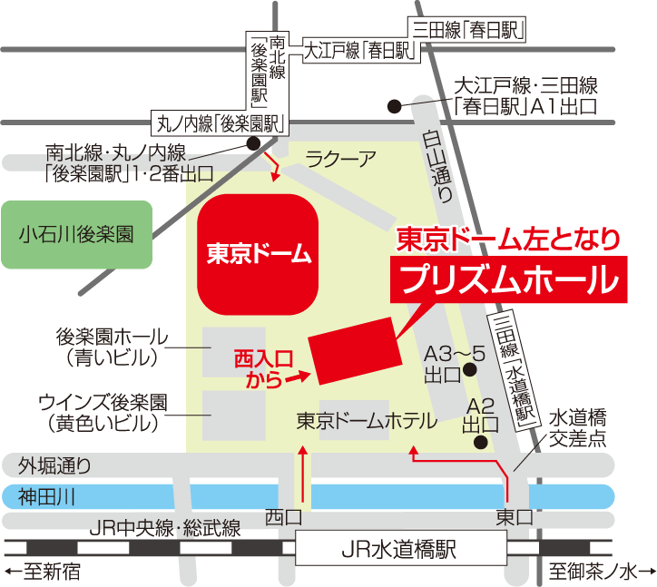 ■電車でお越しの場合 ・JR中央線・総武線「水道橋駅」から徒歩3分 ・都営三田線「水道橋駅」A2~A5出口よりすぐ ・都営大江戸線・三田線「春日駅」A1出口より徒歩5分 ・東京メトロ南北線・丸ノ内線「後楽園駅」1、2番出口より徒歩5分 |