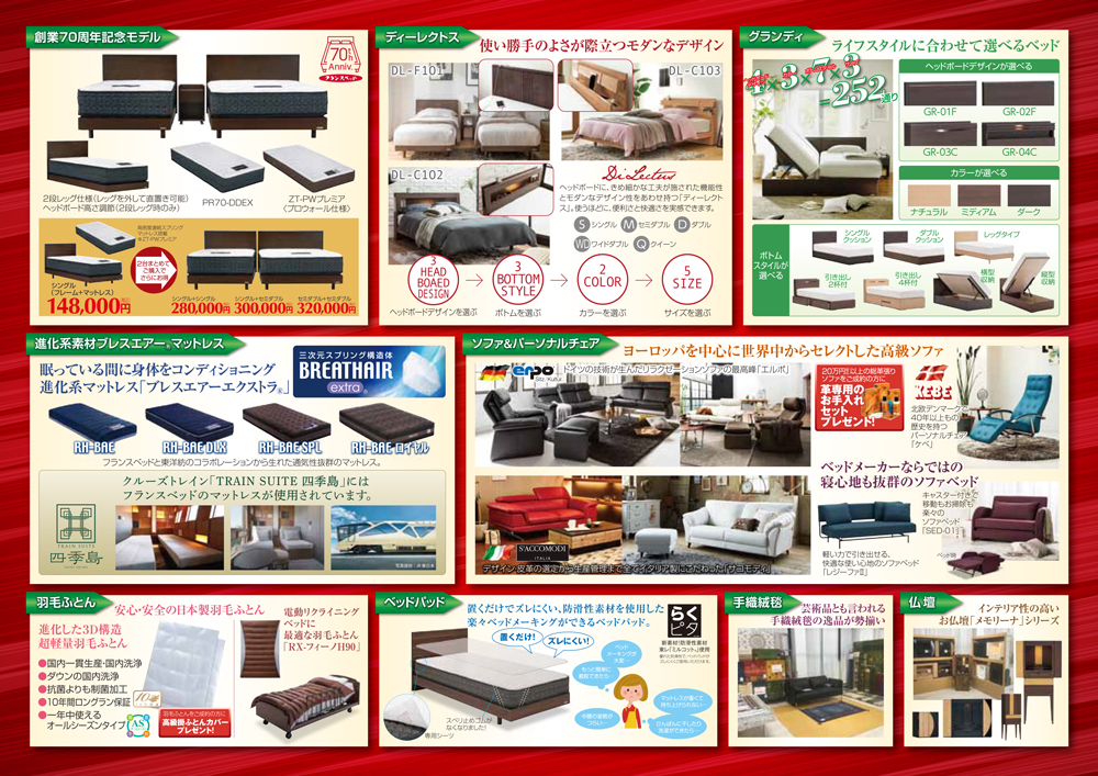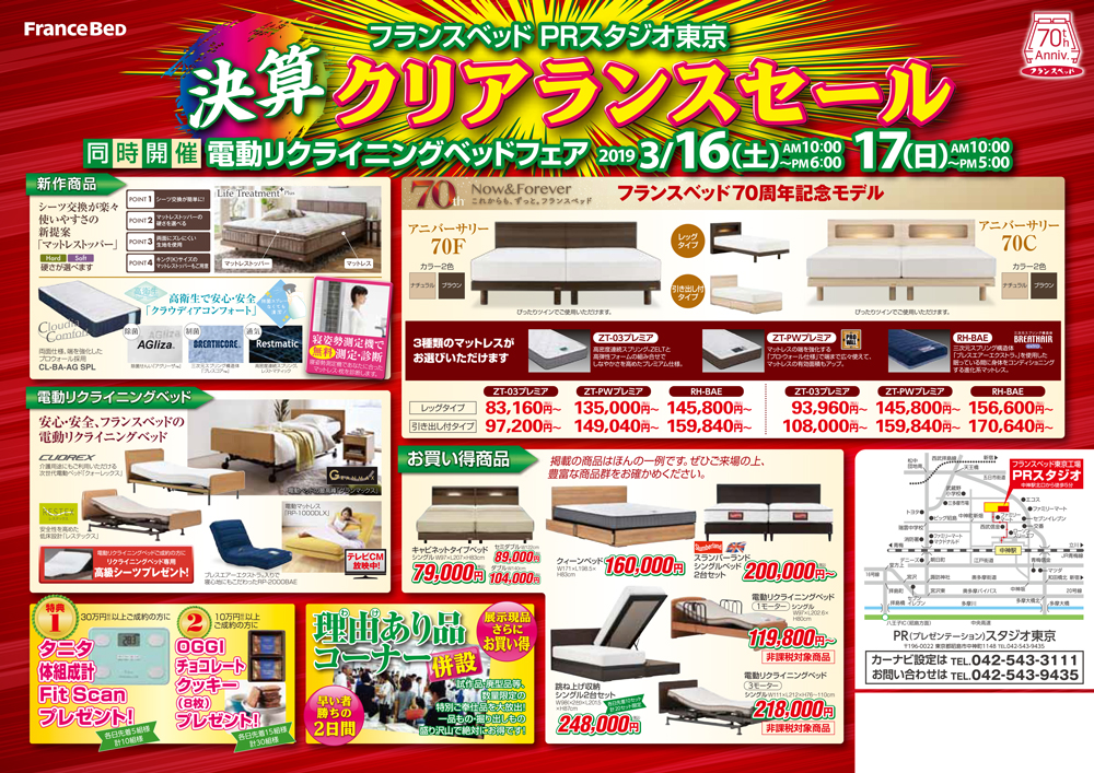 2019年ニューモデルも工場限定お買得価格にて、いち早く特別ご提供! フランスベッド創業70周年記念モデルベッドも超お得に展示出品! |