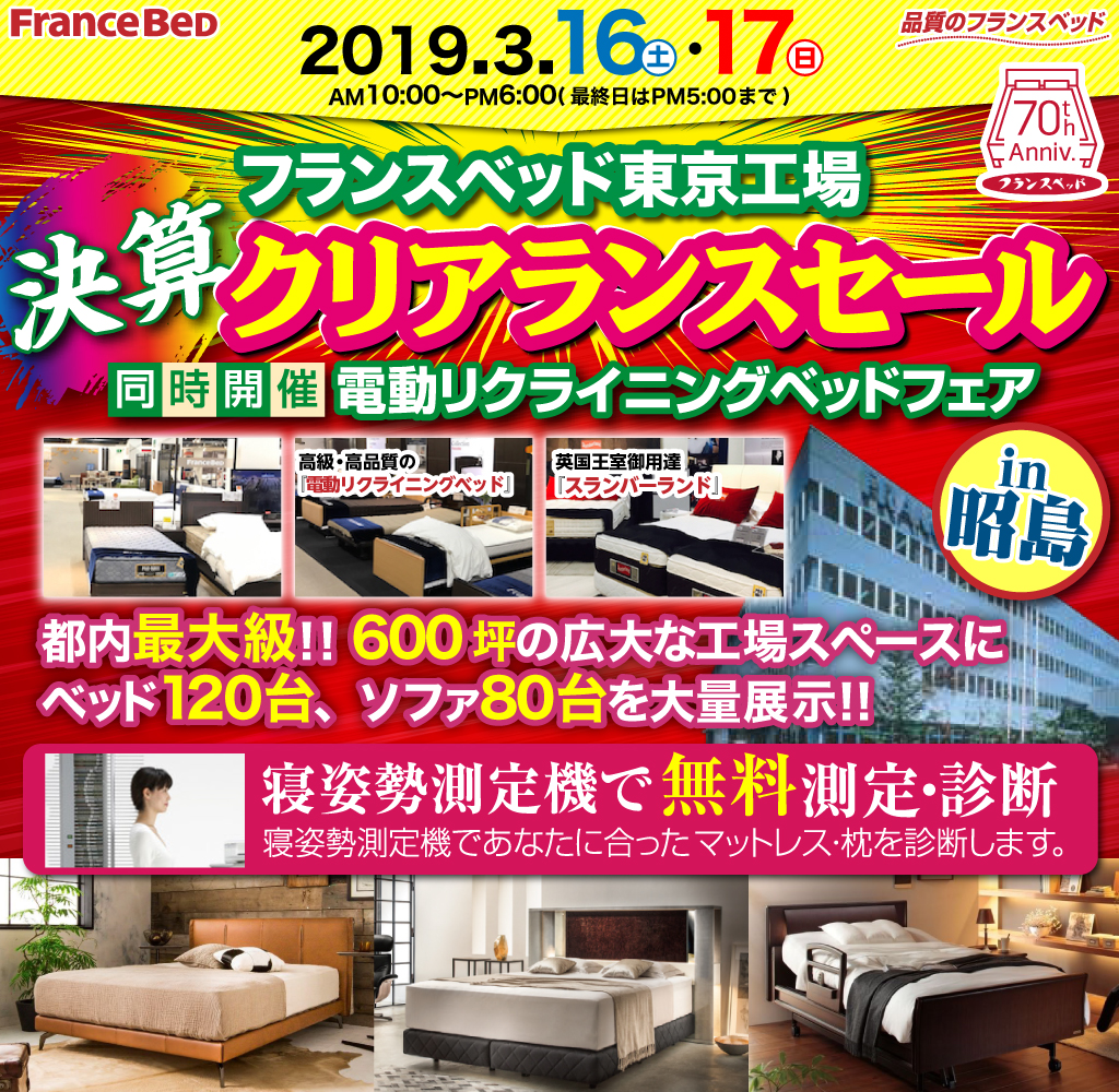 2019年ニューモデルも工場限定お買得価格にて、いち早く特別ご提供! フランスベッド創業70周年記念モデルベッドも超お得に展示出品! |