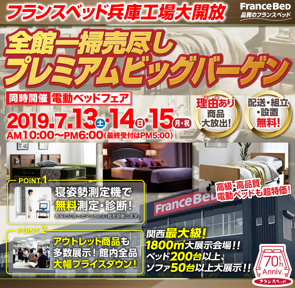 フランスベッド兵庫工場大開放・完全売り尽くし・全館全品クリアランスセール!新作、展示現品も全商品、格安ビッグバーゲン超特価にて特別大処分!