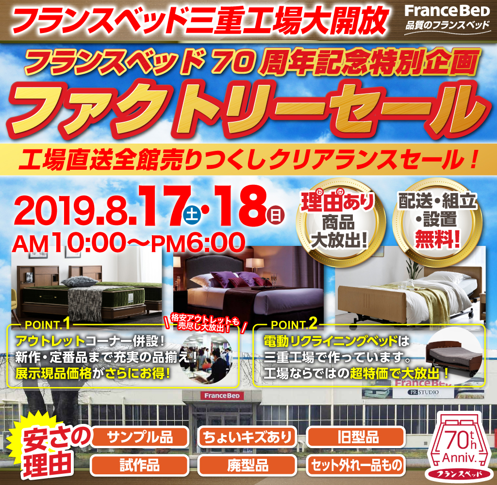 フランスベッド三重工場大開放・完全一掃セール! 新作、展示現品も全商品、超特価にて特別大処分! |