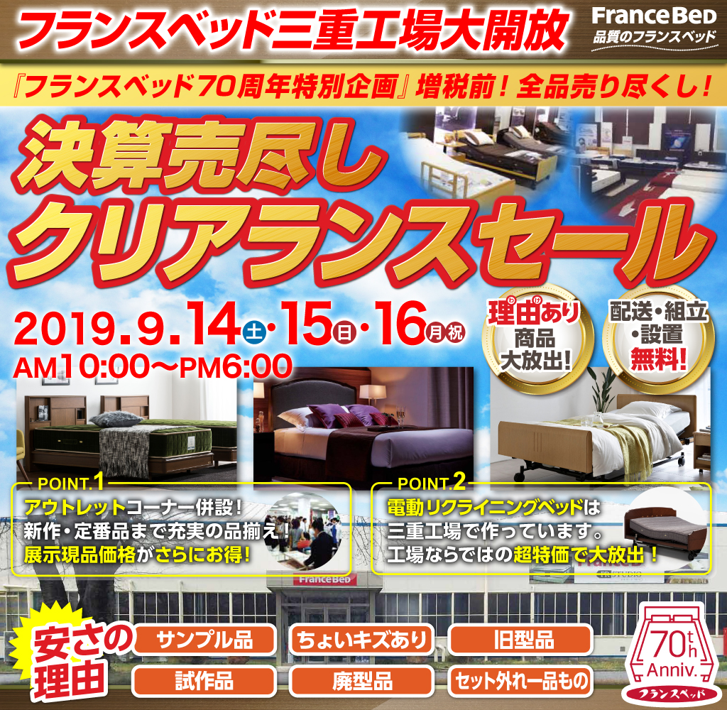 フランスベッド三重工場大開放・完全一掃セール! 新作、展示現品も全商品、超特価にて特別大処分! |