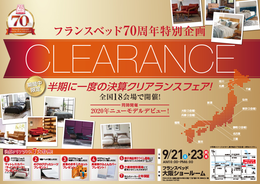 フランスベッド大阪ショールーム『全館全品売り尽くしクリアランス!』 数量限定の特別ご奉仕品、展示現品も3日間限りの超特価にて大放出! |