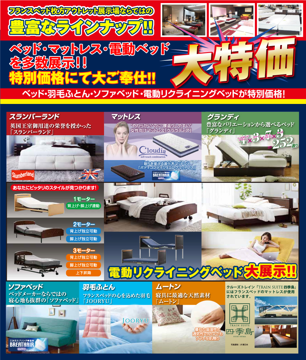 フランスベッド 枚方アウトレット・全品完全売尽しセール!大幅プライスOFF!新作、展示現品も全商品、超特価にて特別大処分! 新作・展示現品・数量限定品・廃型品など、当サイト特別価格でご提示いたします! |