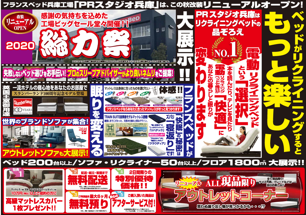 フランスベッド兵庫工場大開放・全館全品クリアランスセール! 新作、展示現品も全商品、限定特別価格にて特別ご提供! |