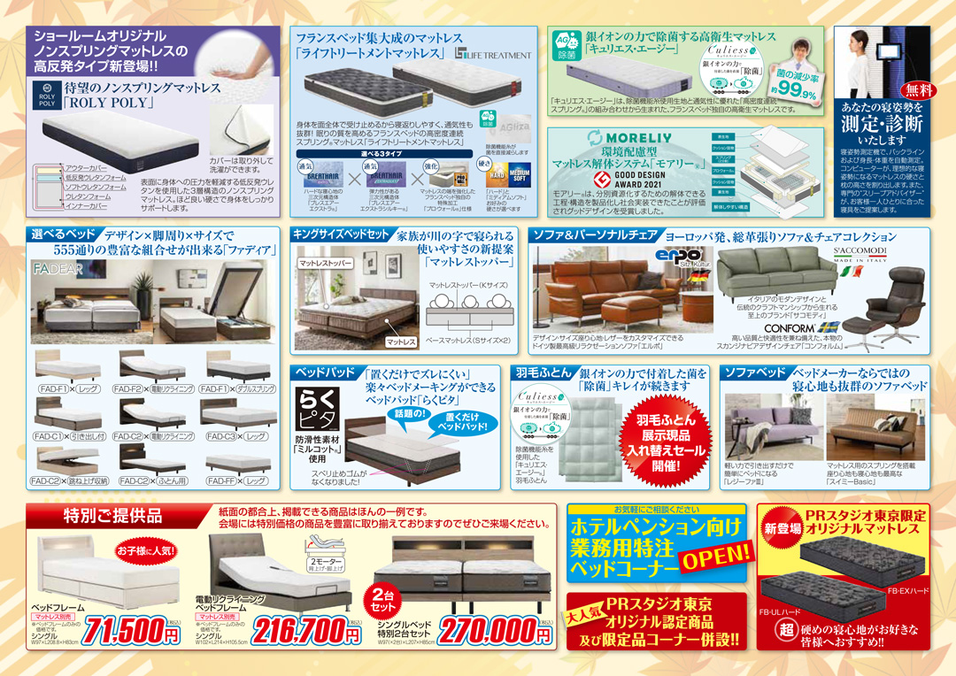 ショールームオリジナル、ノンスプリングマットレスの高反発タイプ新登場! 待望のノンスプリングマットレス「ROLY POLY」もお得に出品、展示!存分に、ご体感もしていただけます! |