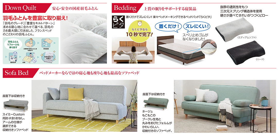 ライフスタイルに合わせて、豊富なバリエーションからお選びいただける新登場のベッド「グランディ」シリーズもお買得に、いち早く展示出品!
