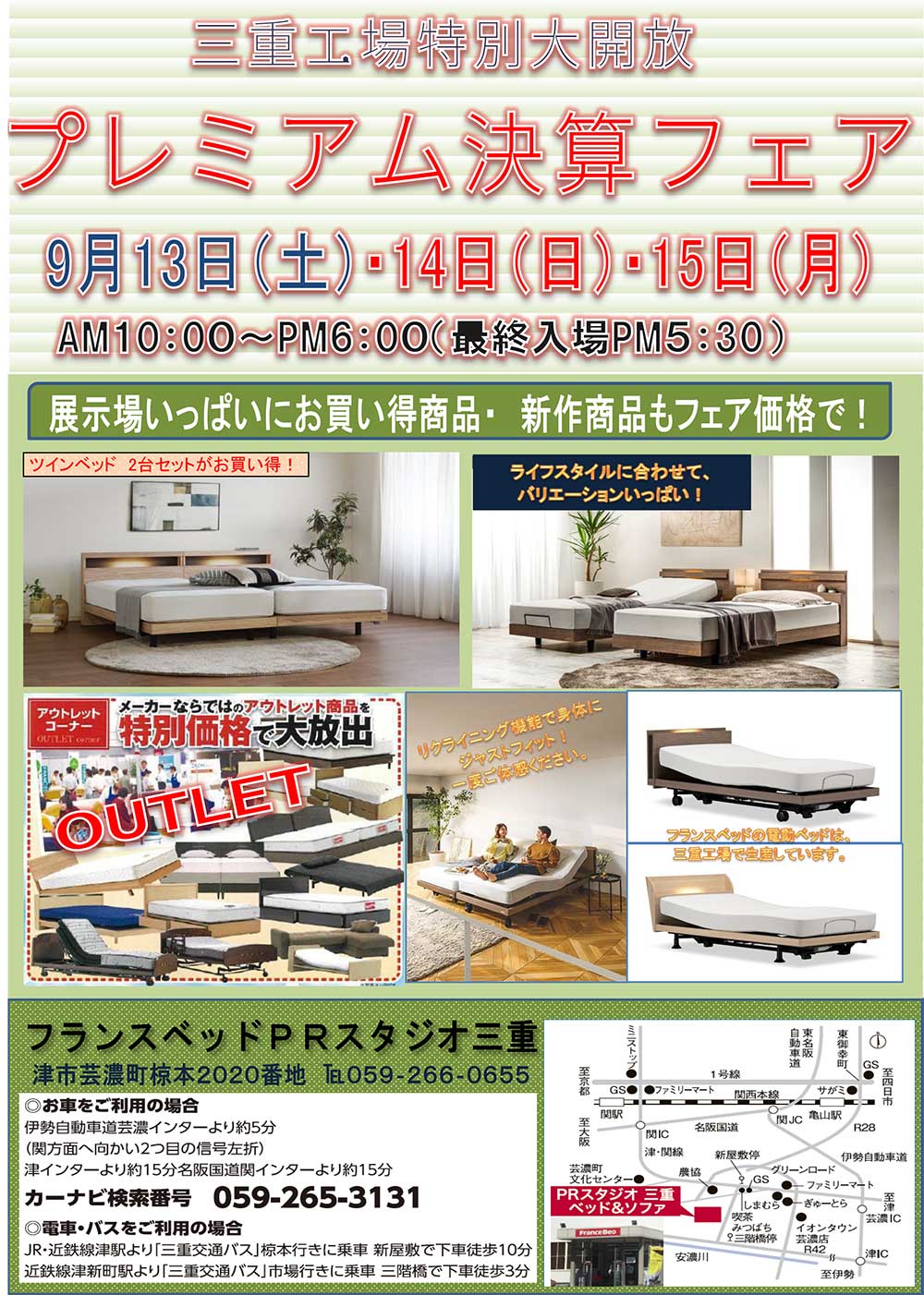 フランスベッド三重工場大開放! 新作、展示現品も全商品、特別ご優待にてご提供! |