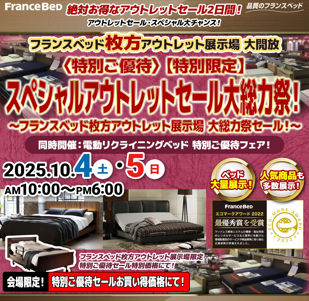 フランスベッド枚方アウトレット・全品特別ご優待スペシャルセール! 新作、展示現品も全商品、特別価格! 新作・展示現品・数量限定品など、当サイト特別価格でご提示いたします! |
