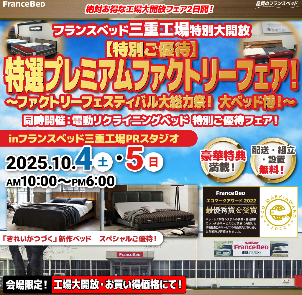フランスベッド三重工場大開放! 新作、展示現品も全商品、特別ご優待にてご提供! |