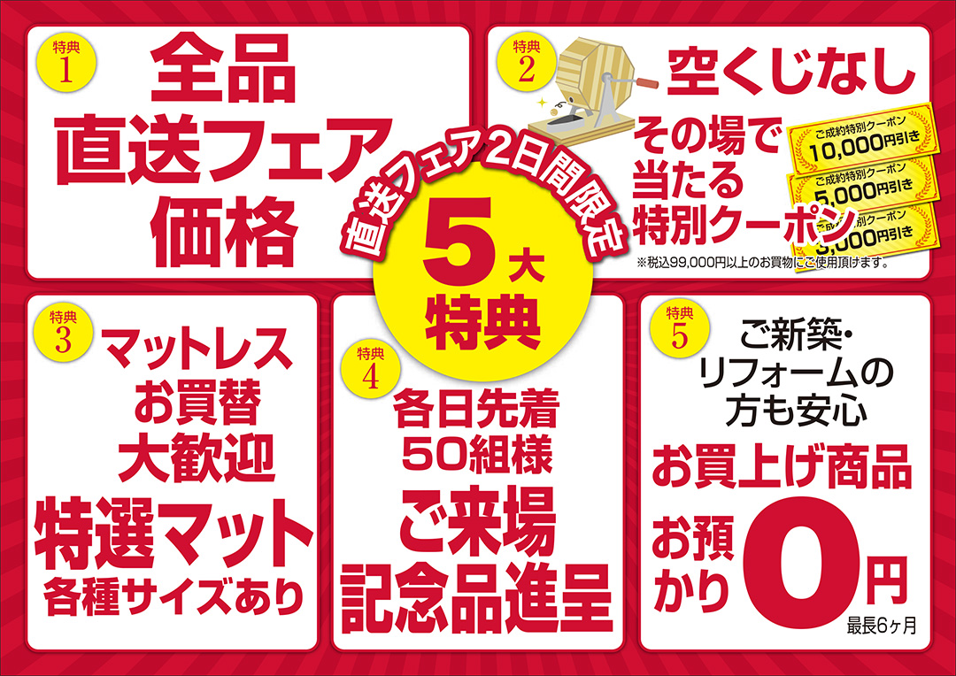 工場直送フェア特別ご提供商品もお買得に大展示! 数量限定の特別ご奉仕品も特別価格にて! ニューモデルも工場直送セール限定お買得価格にて、いち早く特別ご提供! |