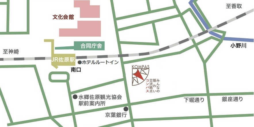 ■電車でお越しの場合 JR成田線「佐原駅」北口より徒歩約10分。 または、佐原駅よりタクシーで約3分。 駅から「香取市役所」方面へ向かい、「小野川沿い」に位置しています。 ■車での主要経路 東関東自動車道「佐原香取IC」より北に約3.5km。 |