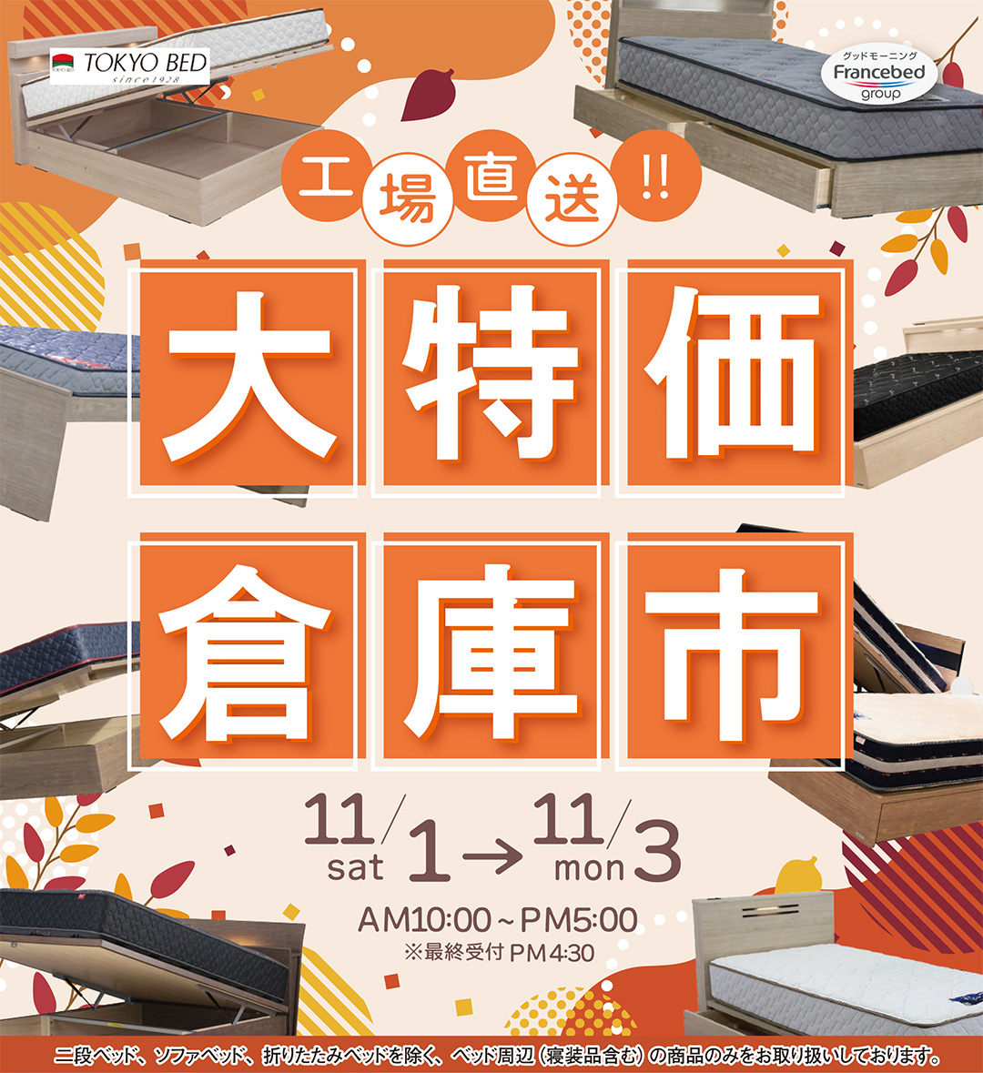 高品質ベッドを、東京ベッドの工場バーゲン特別イベントならではの大特価でご提供!展示品が無くてもご優待価格でご案内! |