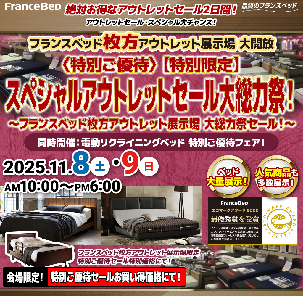フランスベッド枚方アウトレット・全品特別ご優待スペシャルセール! 新作、展示現品も全商品、特別価格! 新作・展示現品・数量限定品など、当サイト特別価格でご提示いたします! |