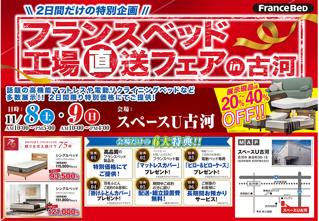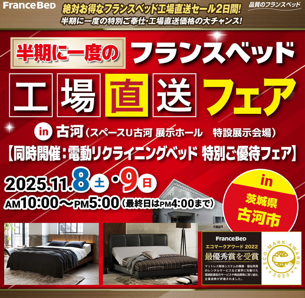 フランスベッド工場直送スペシャルフェア! 新作、展示現品も全商品、工場直送フェア特別価格にてご提供! |