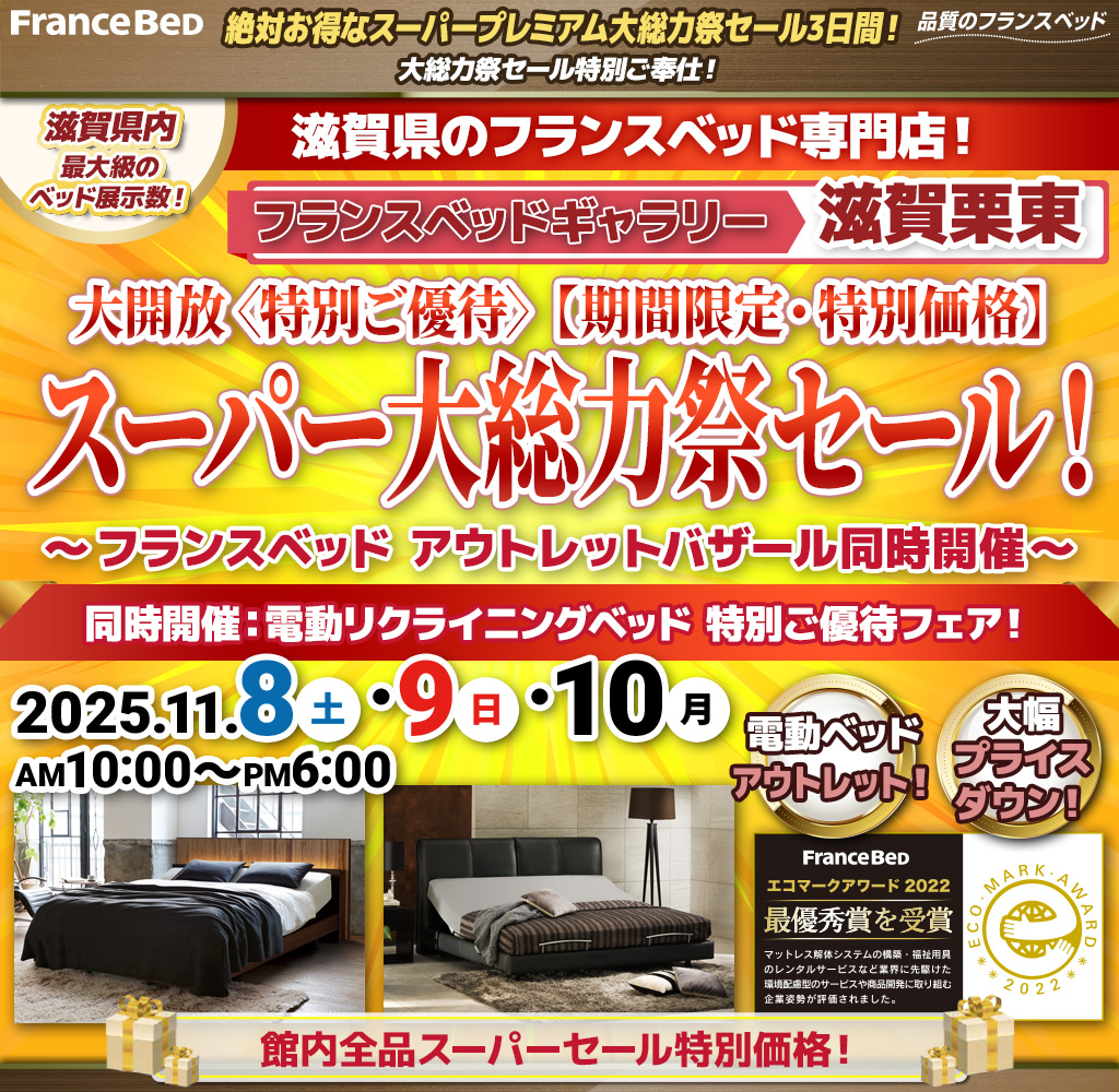 フランスベッドギャラリー滋賀栗東グランドオープンスペシャルフェア! 新作、展示現品も全商品、アウトレット特別価格にてご提供! |