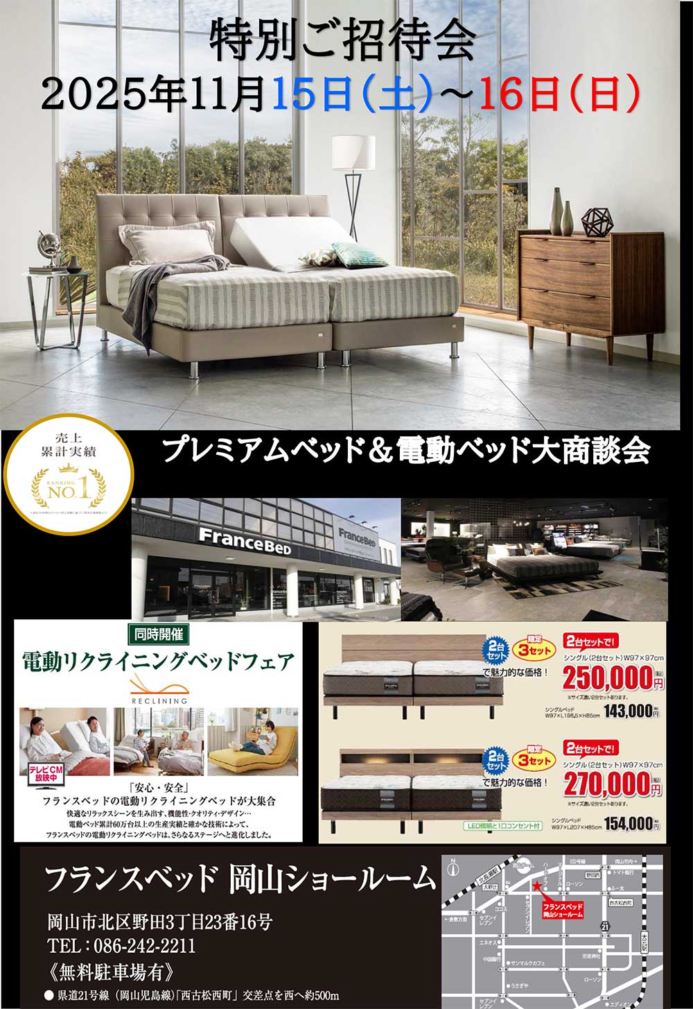 高品質フランスベッドをフランスベッド岡山ショールーム限定特別価格でご提供! |