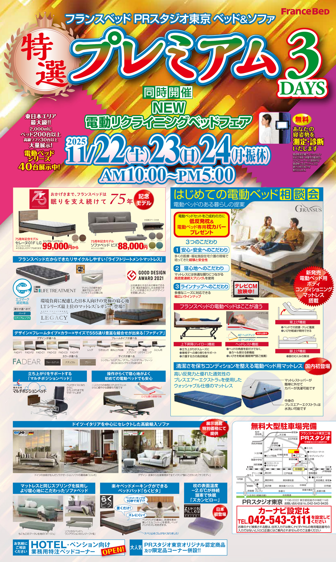「電動リクライニングベッドご優待フェア特別開催!デザイン性と機能性を両立した『グランサス』新登場!寝心地など存分にお試しいただけます!」