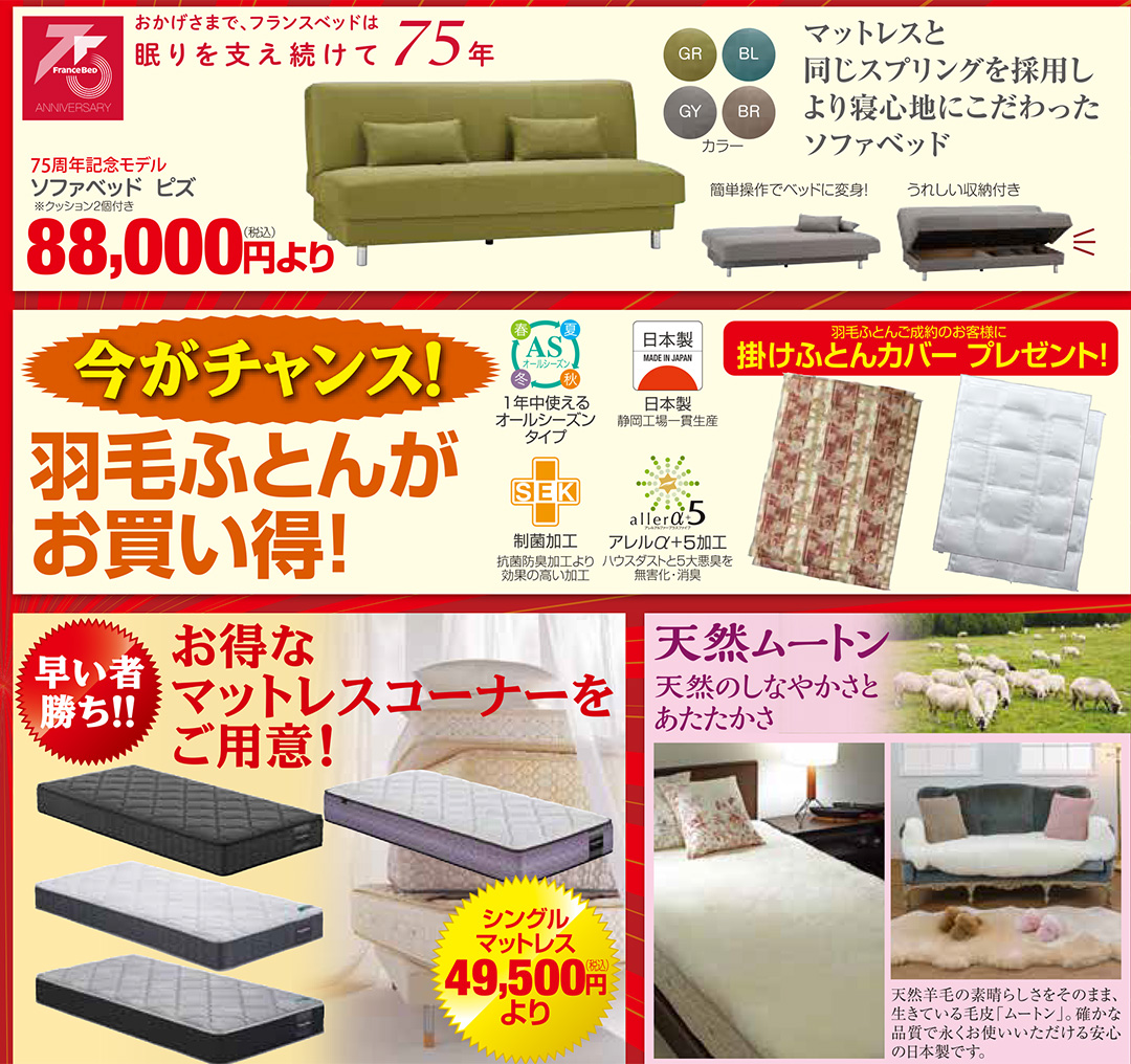 フランスベッドスペシャルフェア! 新作、展示現品も全商品、フェア特別価格にてご提供! |