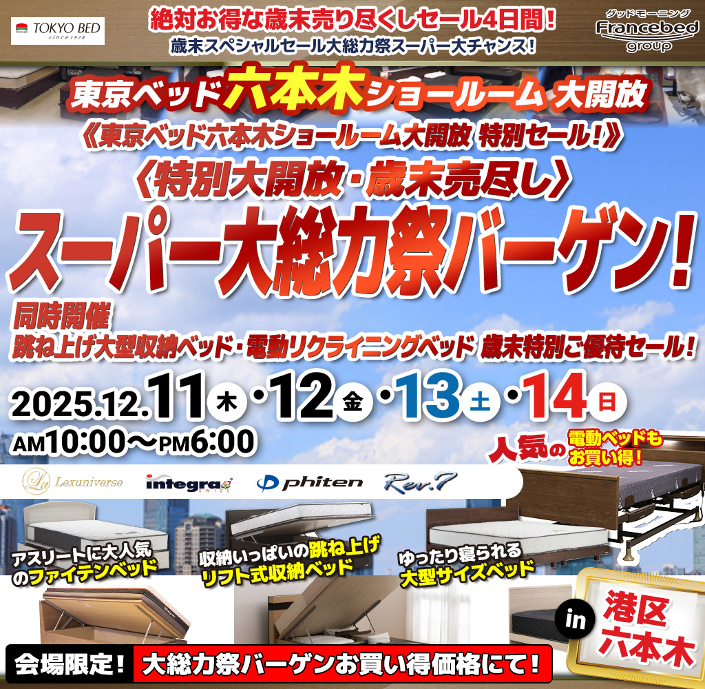 高品質ベッドを、東京ベッドのバーゲン特別セールイベントならではの大特価でご提供 展示品が無くてもご優待価格でご案内! |