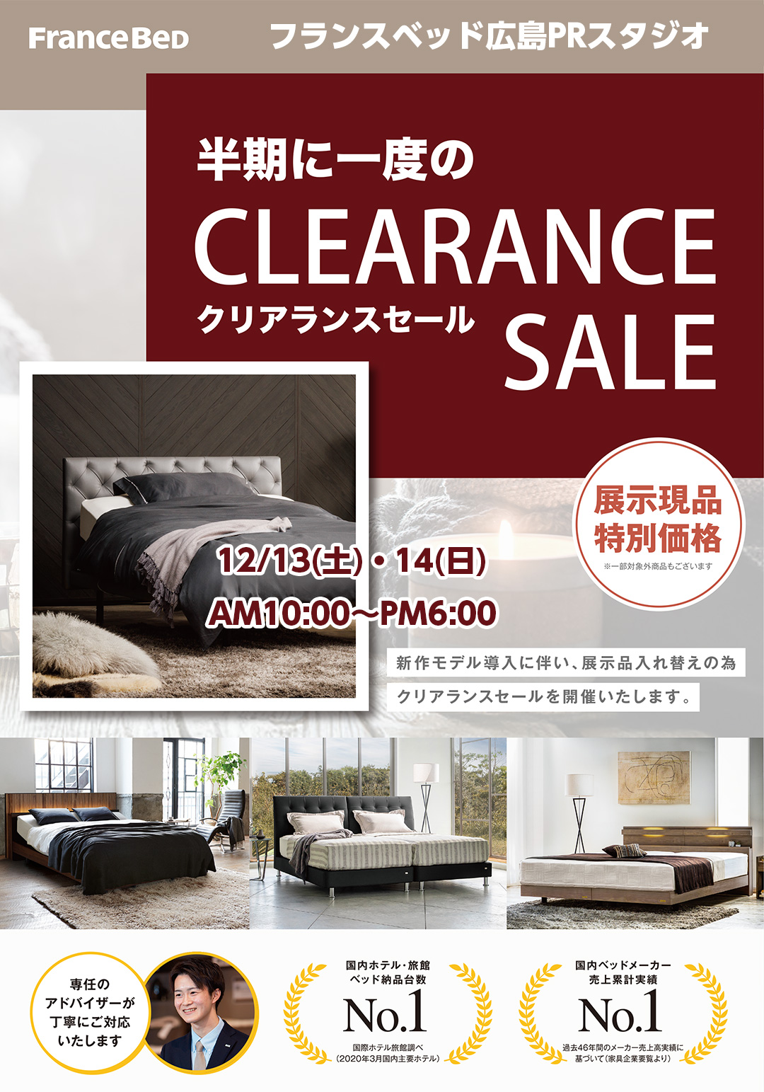 | 開催会場 | フランスベッド広島PRスタジオ (広島で唯一のフランスベッドショールーム、プレゼンテーションスタジオでございます) |