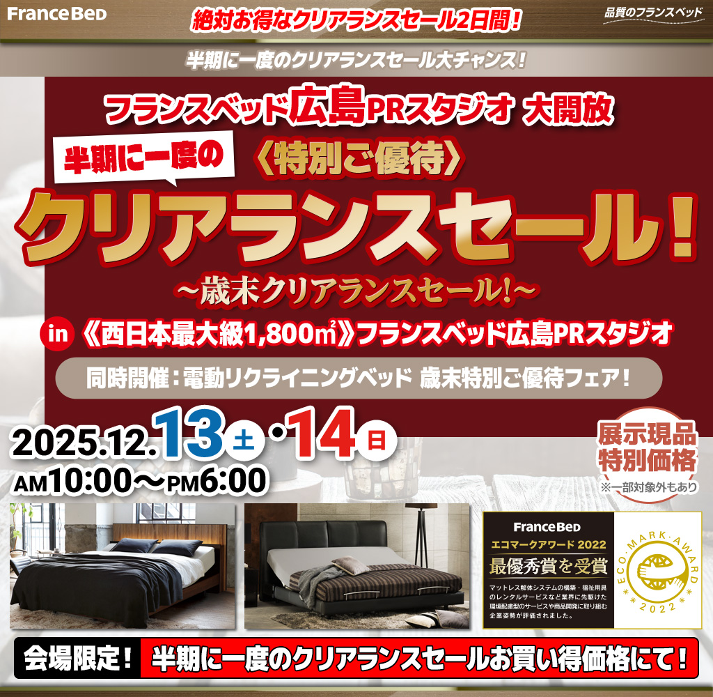 | 開催会場 | フランスベッド広島PRスタジオ (広島で唯一のフランスベッドショールーム、プレゼンテーションスタジオでございます) |