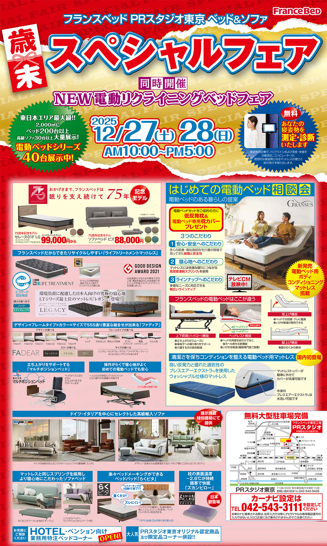 ※カーナビには、TEL042-543-3111「フランスベッド東京工場」と設定をお願いいたします。