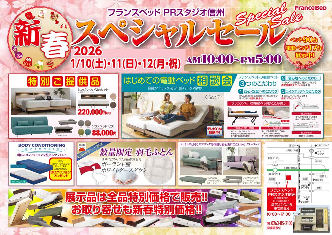 フランスベッドの集大成「ライフトリートメントマットレス」も、たいへんお得に出品、展示!存分にご体感いただけます! ライフトリートメントマットレスご成約の方にクイックシーツプレゼント! |