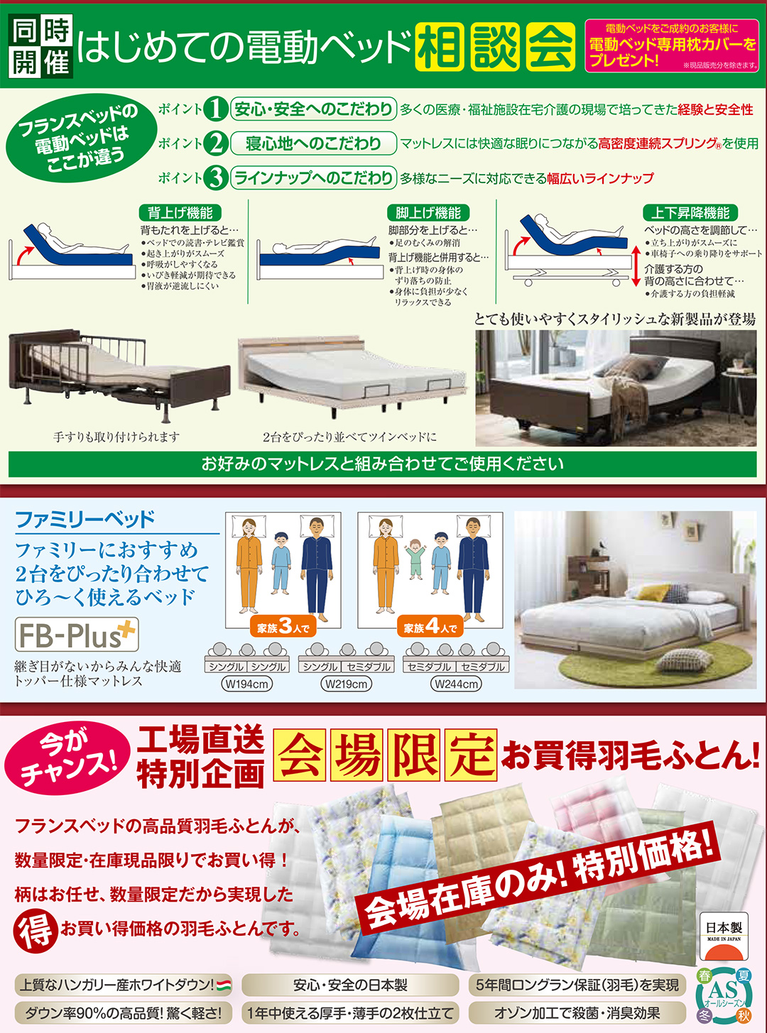 安心・安全の国内一貫生産、日本製羽毛ふとんも限定特価にて、特別出品! |