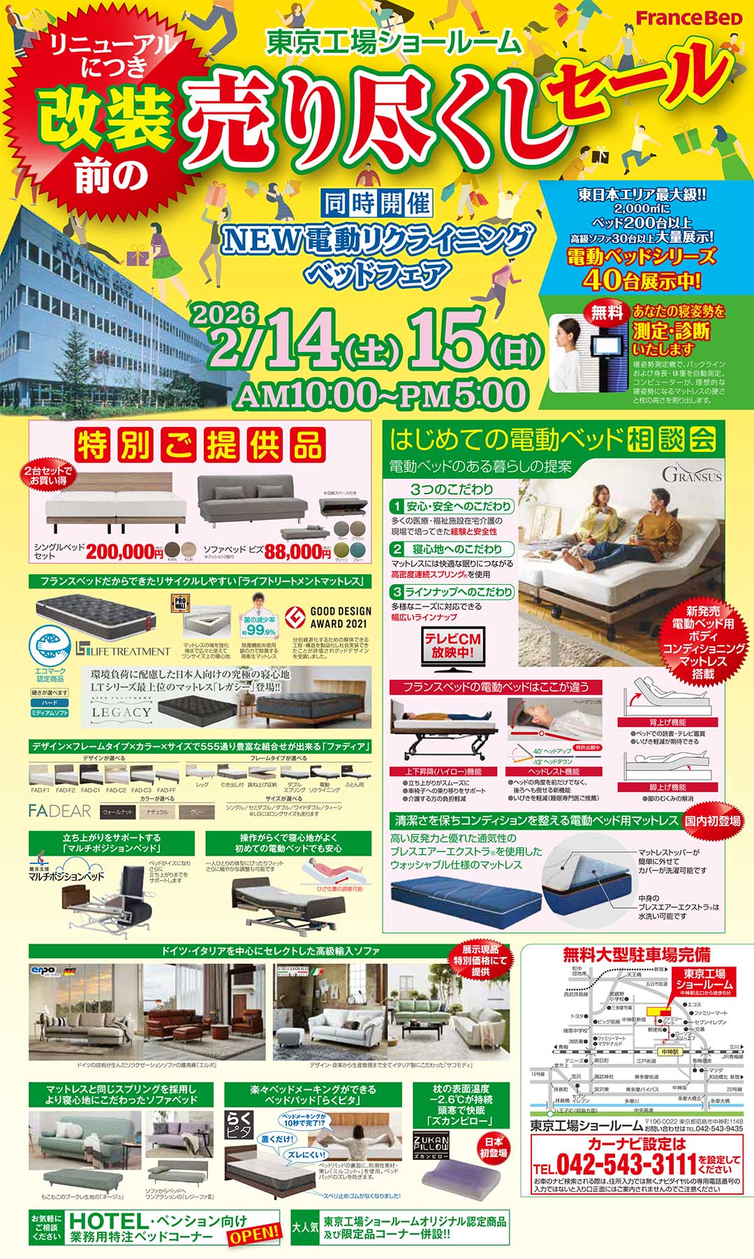 ■電車でお越しの場合 JR青梅線「中神駅」北口より徒歩5分 ※JR中央線「新宿駅」より「中神駅」まで青梅特快で約30分! ■お車でお越しの場合 中央高速 八王子IC下車、約20分 ※カーナビには、TEL042-543-3111「フランスベッド東京工場」と設定をお願いいたします。 |