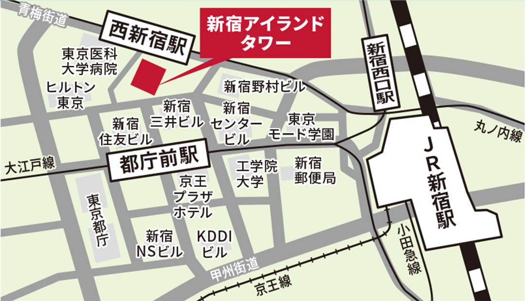 ■電車でお越しの場合 ・東京メトロ丸の内線『西新宿駅』より30秒 ・JR新宿駅、西口改札口より新宿副都心方面へ徒歩約10分 地下道(動く歩道)で出口まで進んでいただき、右手の三井ビルのとなりが新宿アイランドです。 ・都営大江戸線 『都庁前駅』より住友ビル方面へ徒歩約8分 『新宿西口駅』より青梅街道沿い徒歩約10分 ■お車でお越しの場合 ・首都高速道路から 首都高速4号新宿線、新宿出口から約3分 ・青梅街道から 東京医科大学前の信号よりすぐです |