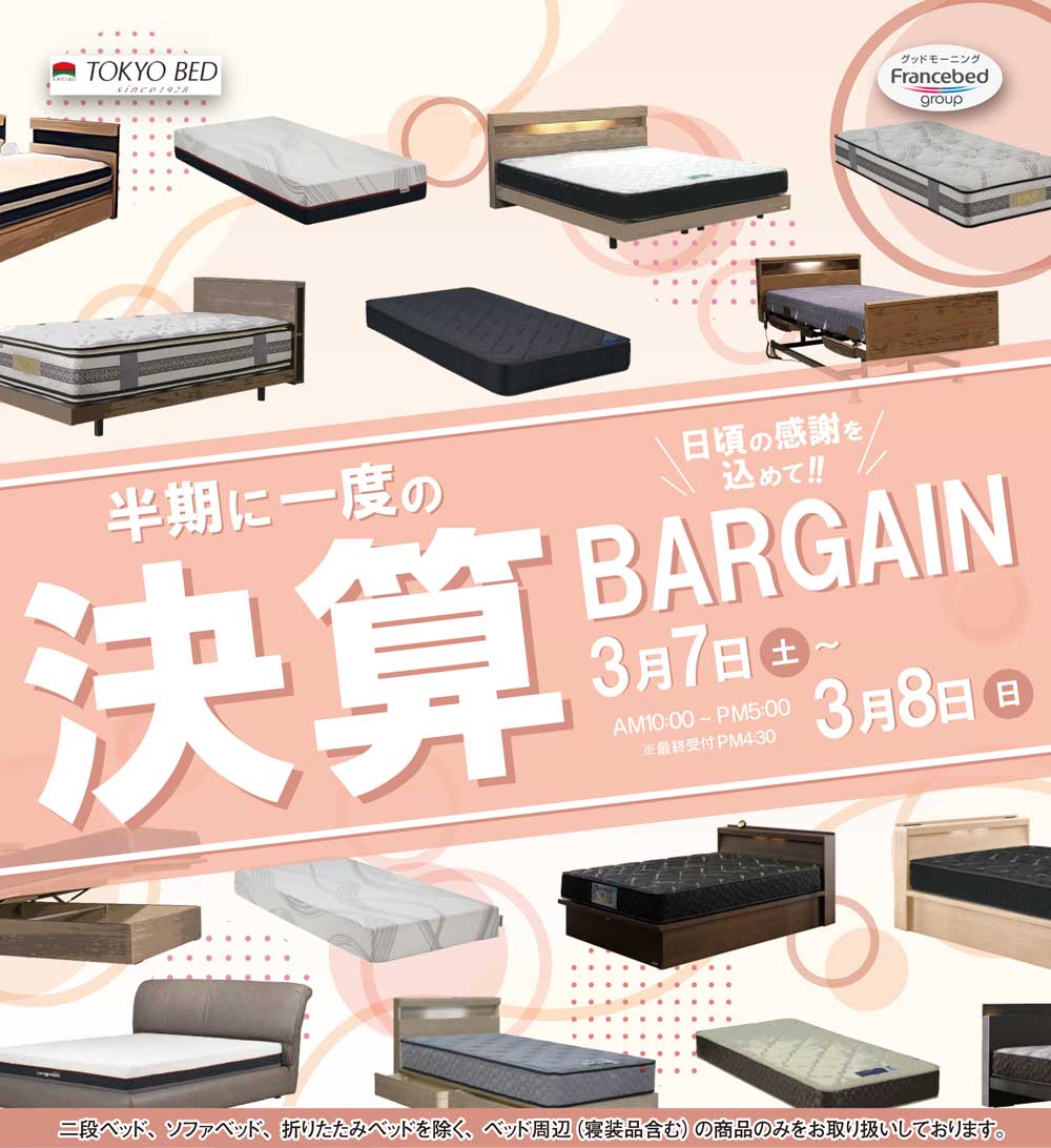 高品質ベッドを、東京ベッドの工場バーゲン特別イベントならではの大特価でご提供!展示品が無くてもご優待価格でご案内! |