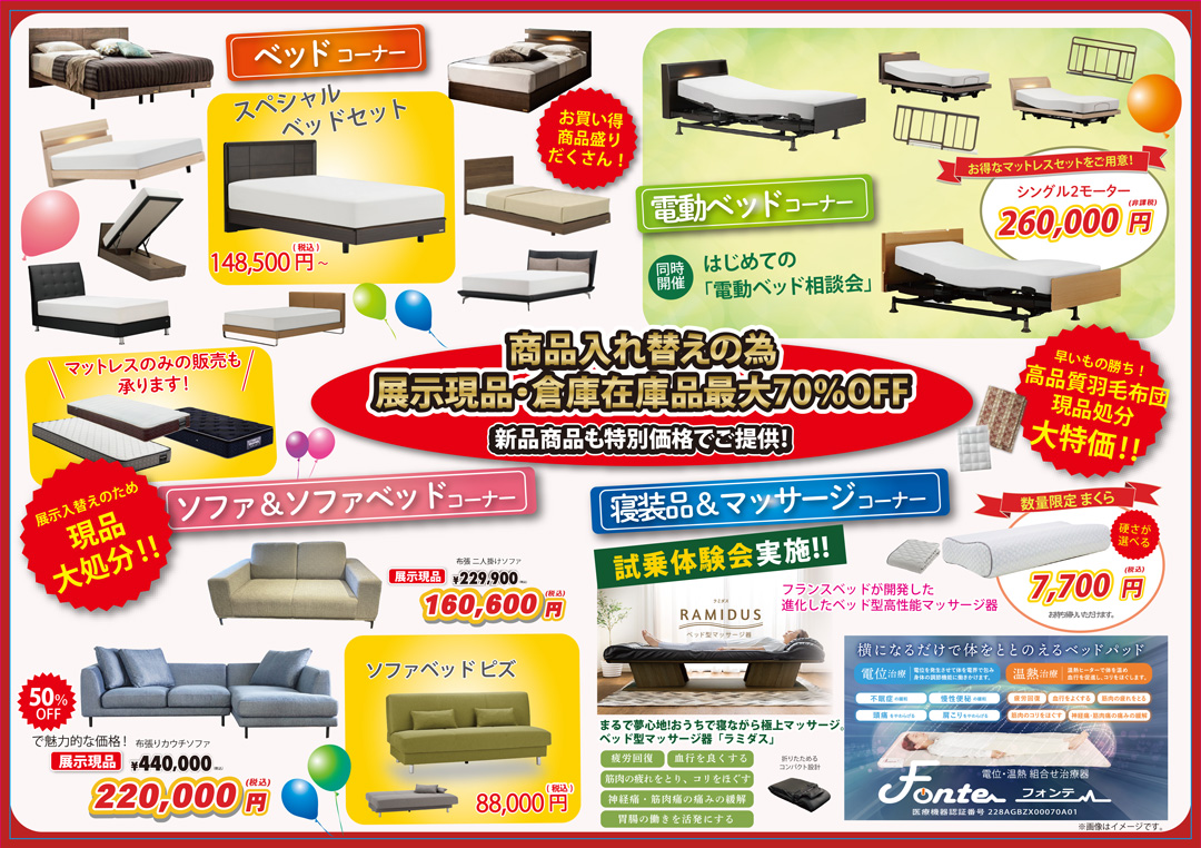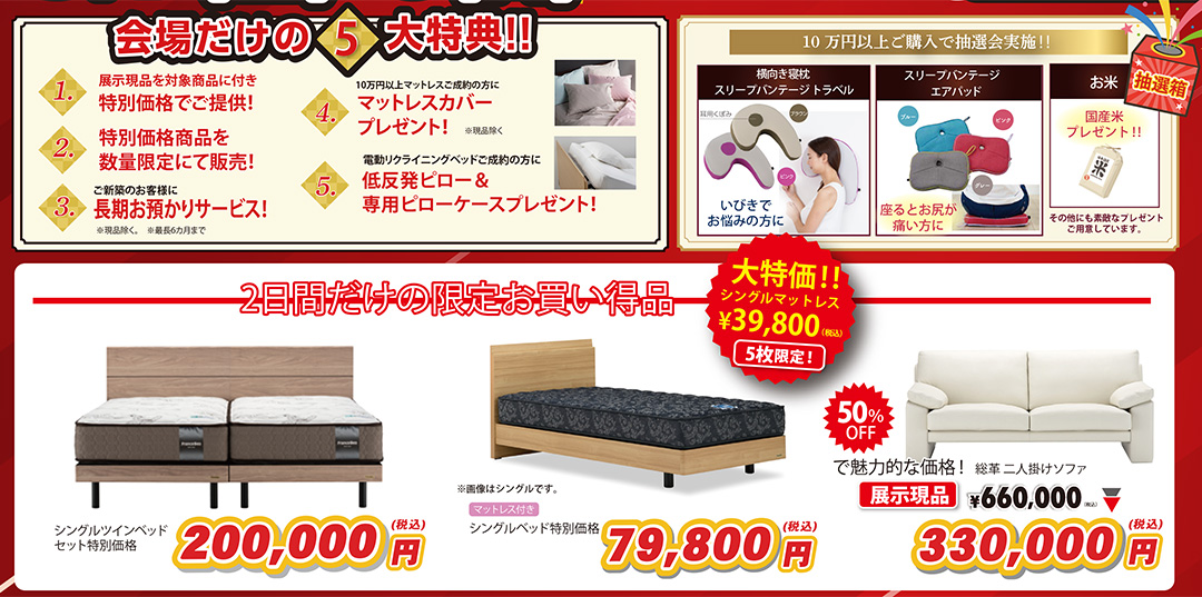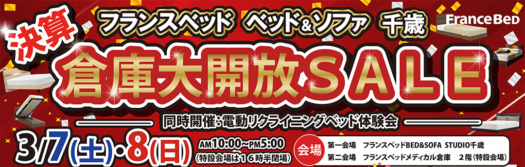 | 開催会場 | 【第一会場】フランスベッド BED&SOFA スタジオ 千歳 特設展示会場 【第二会場】フランスベッドメディカル倉庫 2階 特設展示会場 |