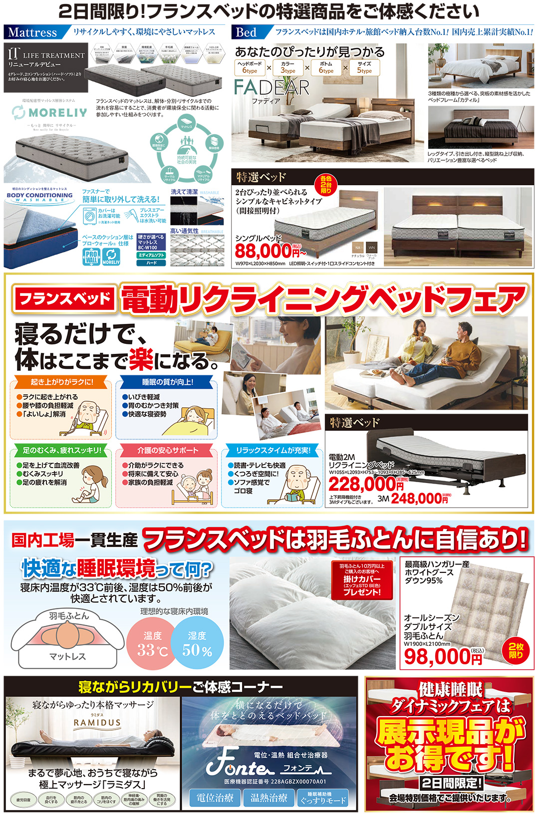 フランスベッド工場直送スペシャルフェア! 新作、展示現品も全商品、工場直送フェア特別価格にてご提供! |
