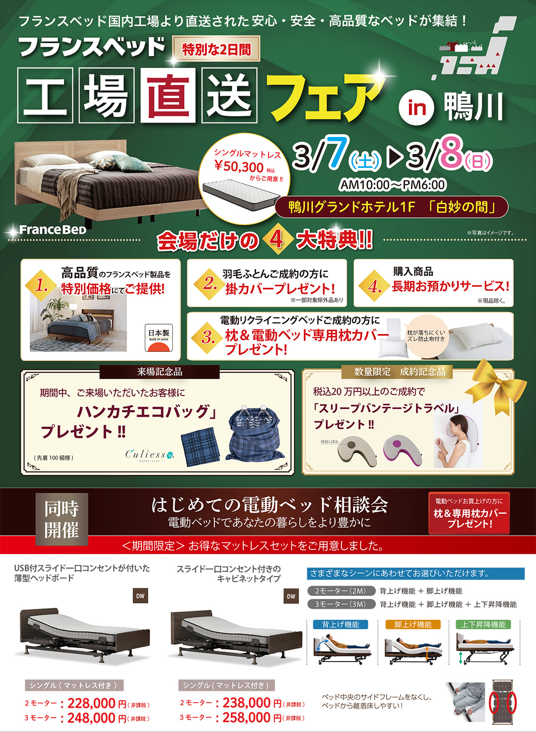 フランスベッド工場直送スペシャルフェア! 新作、展示現品も全商品、工場直送フェア特別価格にてご提供! |