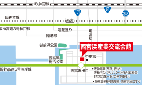 ■電車でお越しの場合 ● 阪神本線「西宮駅」より阪神バス約20分 マリナパーク行 →「西宮浜産業交流会館前」下車すぐ ● JR神戸線「西宮駅」より阪神バス約20分 マリナパーク行 →「西宮浜産業交流会館前」下車すぐ ● 阪急神戸線「西宮北口駅」より阪神バス約25分 マリナパーク行 →「西宮浜産業交流会館前」下車すぐ ■お車でお越しの場合 ● 阪神高速湾岸線でお越しのお客様 ・「西宮浜出口」から約5分 ・「西宮出口」から約5分 ● 名神高速道路でお越しのお客様 ・「西宮IC」から約15分 (43号線経由で西宮浜へ) ● 一般道でお越しのお客様 ・国道43号線「西宮本町」交差点を南進、臨港線を経由し西宮浜へ ・「マリナパーク」方面へ直進、「西宮浜産業交流会館」前 |