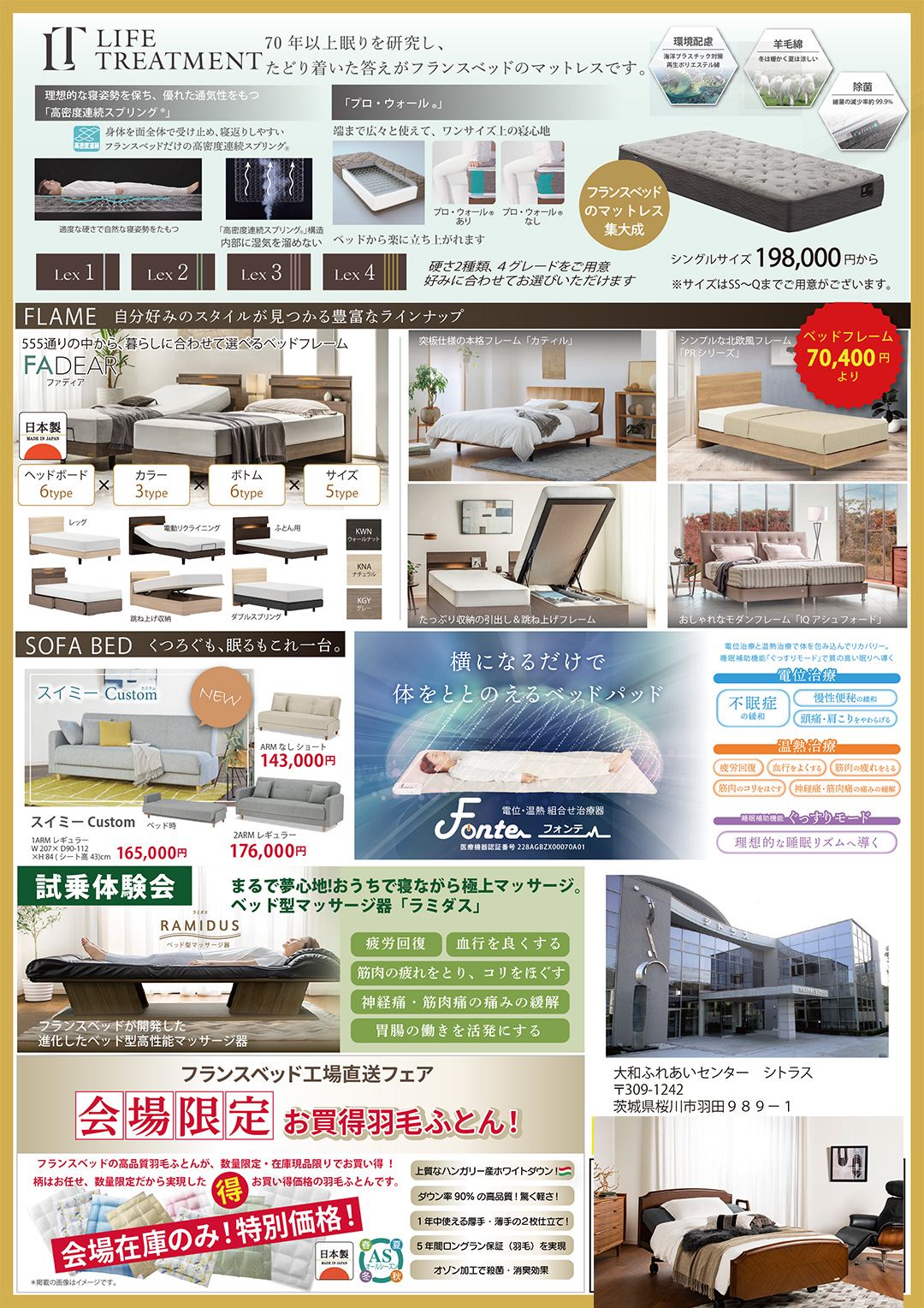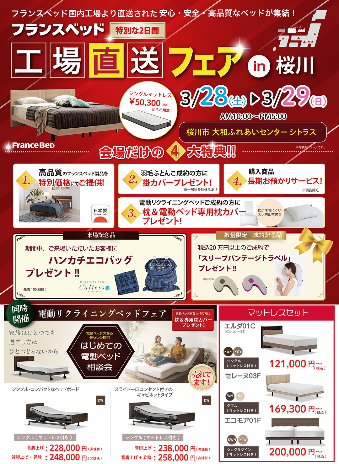 フランスベッド工場直送スペシャルフェア! 新作、展示現品も全商品、工場直送フェア特別価格にてご提供! |