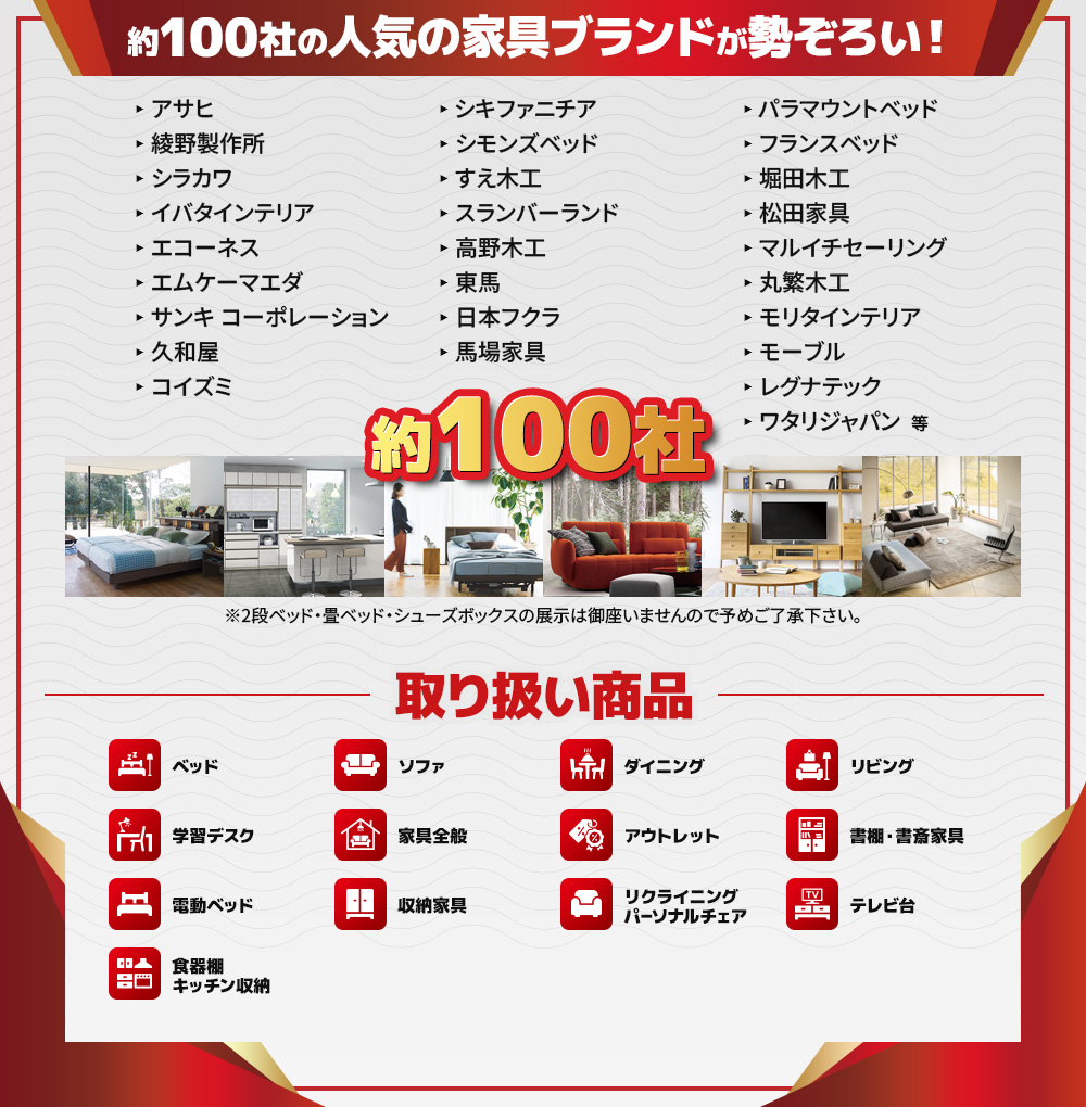 アサヒ、綾野製作所、シラカワ、イバタインテリア、エコーネス、エムケーマエダ、サンキ コーポレーション、久和屋、コイズミ、シキファニチア、シモンズベッド、すえ木工、スランバーランド、高野木工、東馬、日本フクラ、馬場家具、パラマウントベッド、フランスベッド、堀田木工、松田家具、マルイチセーリング、丸繁木工、モリタインテリア、モーブル、レグナテック、ワタリジャパンなど約100社
