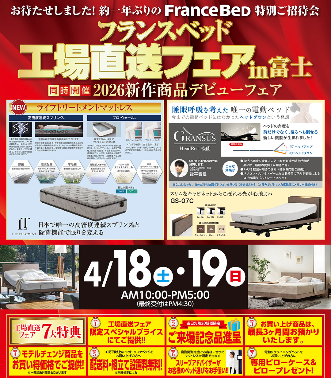フランスベッド工場直送スペシャルフェア! 新作、展示現品も全商品、工場直送フェア特別価格にてご提供! |