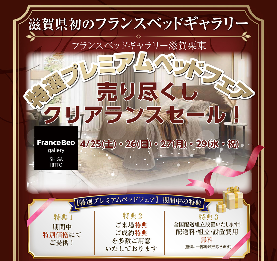 フランスベッドギャラリー滋賀栗東グランドオープンスペシャルフェア! 新作、展示現品も全商品、アウトレット特別価格にてご提供! |