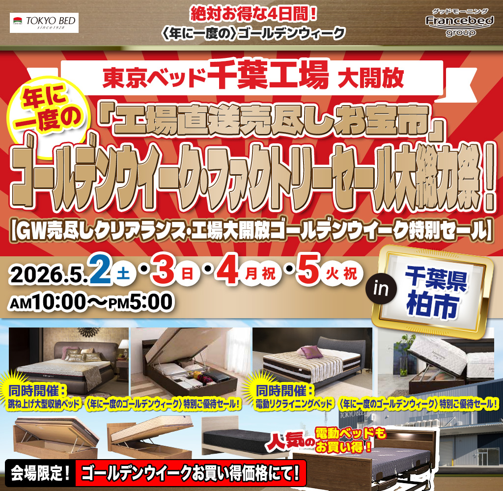 高品質ベッドを、東京ベッドの工場バーゲン特別イベントならではの大特価でご提供!展示品が無くてもご優待価格でご案内! |