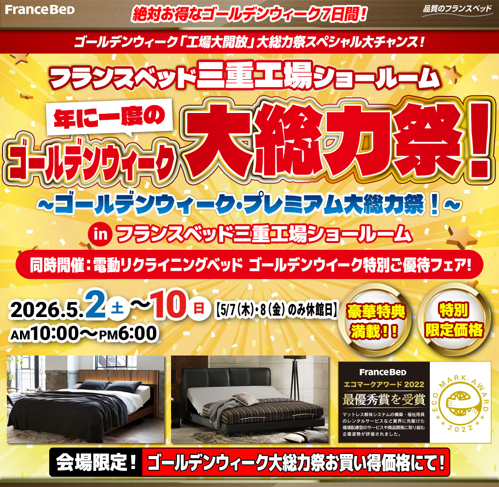 フランスベッド三重工場大開放! 新作、展示現品も全商品、特別ご優待にてご提供! |